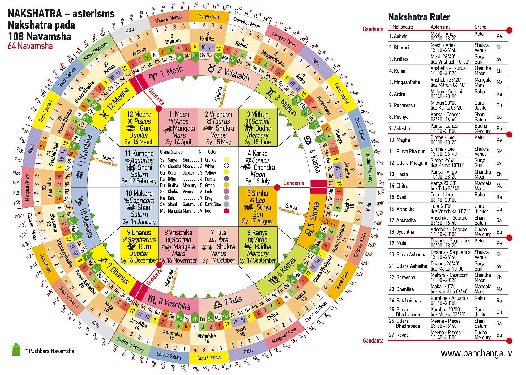 А - 8 часть от 15-ой Р - 2-ая мухурта Г - 6-ая Я - 4-ая